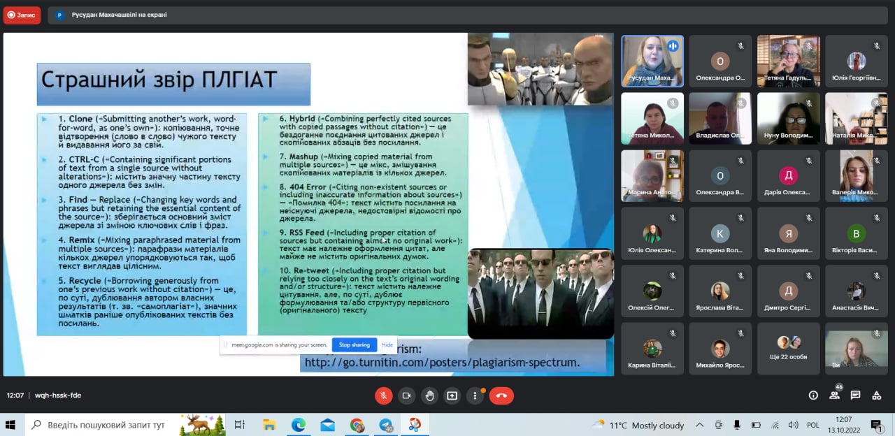 13 жовтня 2022 року завідувач, викладачі, аспіранти та студенти кафедри романської філології та порівняльно-типологічного мовознавства мали відвідали вебінар "Академічний плагіат: як виявити та усунути", за сприяння Наукового товариства студентів, магістрантів, аспірантів та молодих учених Факультету романо-гермнаської філології, на якому спікер, завідувач кафедри германської філології, д.філ.наук., доцент Русудан Кирилевна Махачашвілі піднімала важливі питання академічного плгаіту, його форм та видів плагфату, а також давала практичні поради для уникнення технічних помилок при цитуванні, про новітні засоби для спрощення процедури цитування у дослідженнях.