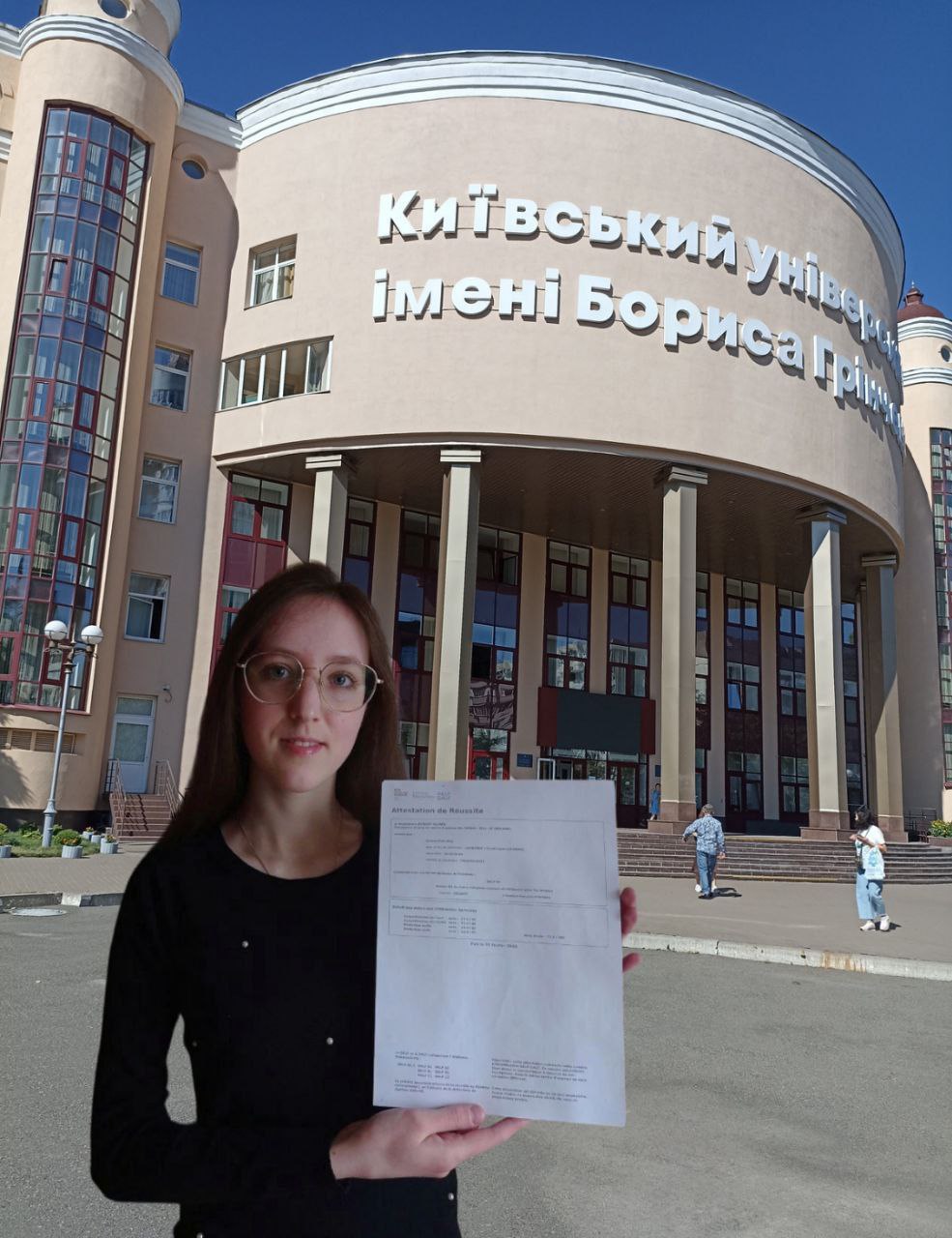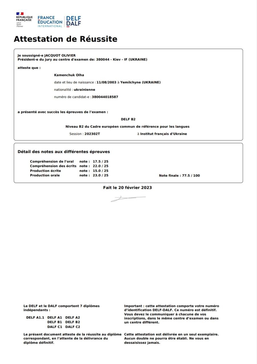 Вітаємо студентку французького відділення, групи ФІНб-1-20-4.0д Каменчук Ольгу та її викладачів з успішним складанням сертифікованого іспиту з французької мови DELF B2! Незважаючи на умови блекауту та постійні оголошення повітряної тривоги в умовах воєнного стану, студентка сміливо й впевнено йшла до своєї цілі! Бажаємо подальших успіхів та звершень!