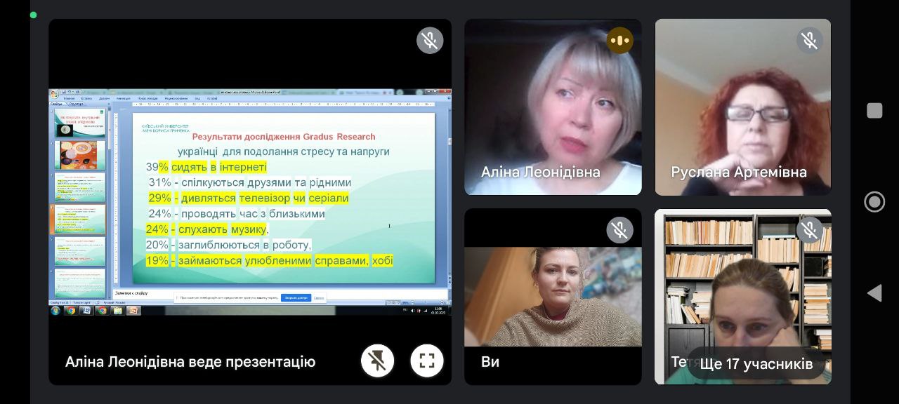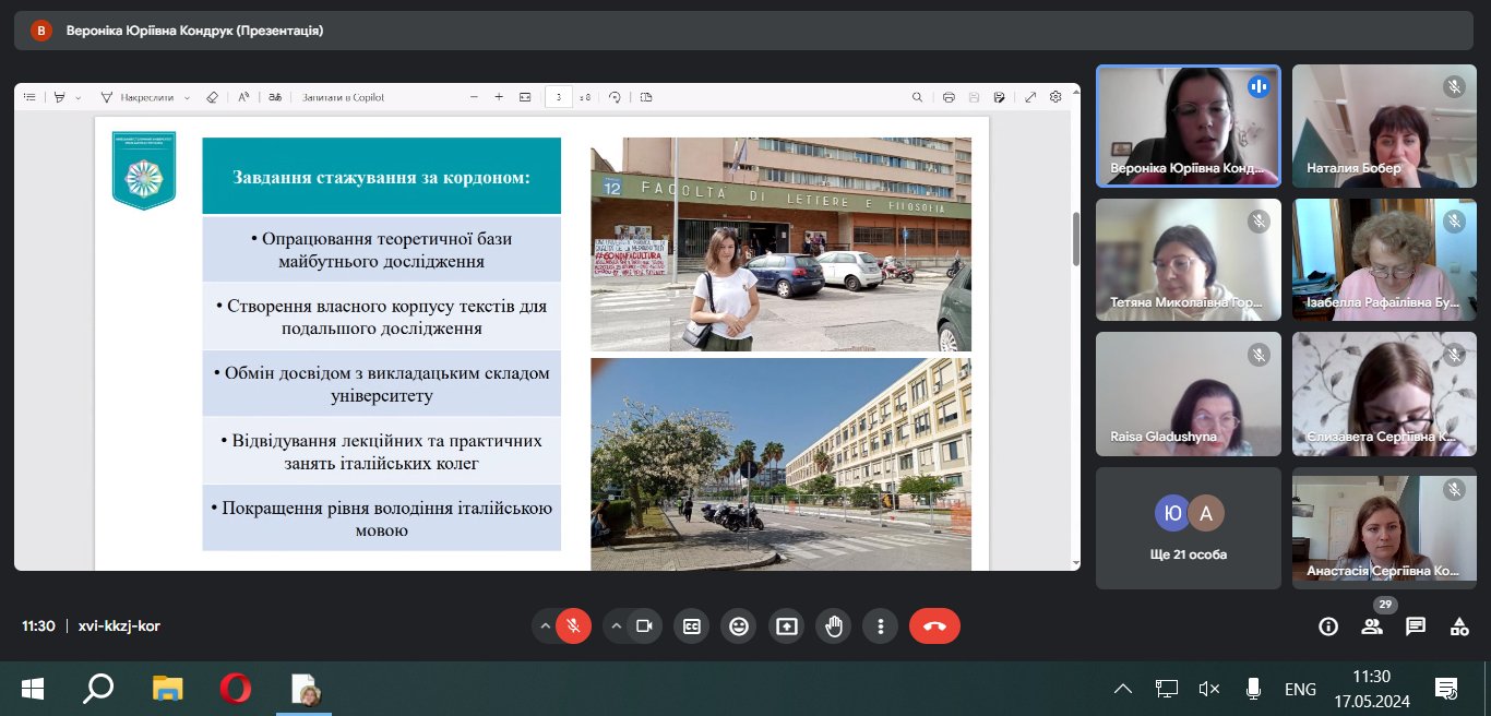 Були представлені результати власних досліджень у галузях перекладознавства, літературознавства, порівняльної та прикладної лінгвістики, розвитку європейських мов у суспільно-культурному вимірі, досвідчених та молодих колег кафедри романської філології, а також здобувачів кафедри магістерського рівня освіти, В.Кондрук. Interlingual interactions between Italian and English: hybridization in Italian periodicals", A. Літвіх. "Перекладацькі трансформації та їх практичне застосування при перекладі іспаномовних текстів", Н.Дровосєкова, Р. Махачашвілі " Між двох мов: як емоційний інтелект диктує перемикання кодів у соціальних мережах" , А.Домбровська, А.Копитіна "Ідеологічний квадрат” політичних промов Дж. Конте" А.Коробець, І. Ласка. Лексико-стилістичні особливості французьких офіційних текстів про війну в Україні, М. Кушнерьова, Р. Махачашвілі. "Роль штучного інтелекту та соціальних мереж у формуванні сучасного літературного дискурсу в іспаномовних країнах", І. Шаповаленко, Р. Махачашвілі. "Концептуальні метафори у висвітленні війни в Україні іспаномовними медіа", Д. Штоліна, Р. Махачашвілі."Функціонально-стилістичні та прагматичні особливості іспанськомовного гумору (на матеріалі мультимодального цифрового корпусу)".