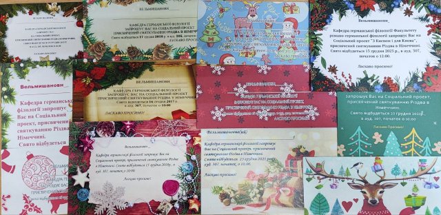 Вже десятий рік поспіль кафедра германської філології Факультету романо-германської філології проводить Соціальний проект “З Києвом і для Києва”, присвячений святкуванню Різдва в Німеччині (Порошина Валентина Дмитрівна, старший викладач кафедри германської філології Факультету романо-германської філології).