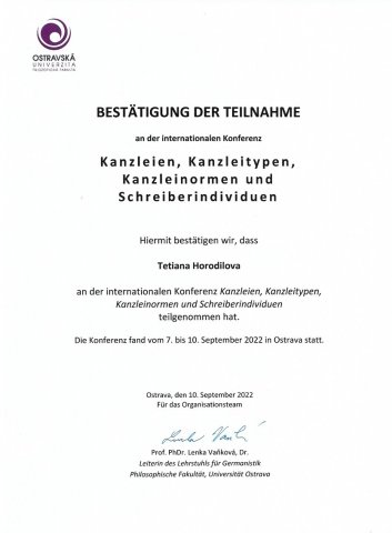 Колега та аспірантка третього року навчання Тетяна Городілова взяла участь у конференції "Kanzleien, Kanzleitypen, Kanzleinormen und Schreiberindividuen", що відбулася з 7 по 10 вересня 2022 року у м. Острава, Чехія. Тетяна виступила з доповіддю на тему "Auf dem Weg zur Grammatikalisierung: Satznegation im Frühneuhochdeutschen", що є дотичною до її дисертаційного дослідження. Обмін науковими здобутками як досвідчених лінгвістів-германістів, так і аспірантів і докторантів проходив у приємній і дружній атмосфері лекцій, доповідей і дискусій під час засідання робочої групи. Очікується публікація матеріалів конференції видавництвом Praesens Verlag (der Verlag an der Donau)